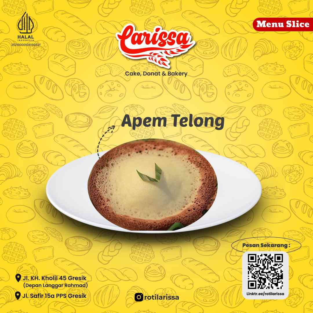 Apem Telong dikemas dengan daun pisang untuk mempertahankan keaslian cita rasa tradisional, atau dalam mika transparan untuk kemasan yang lebih modern. Kemasan ini menjaga kesegaran dan kelezatan kue hingga sampai ke tangan konsumen.