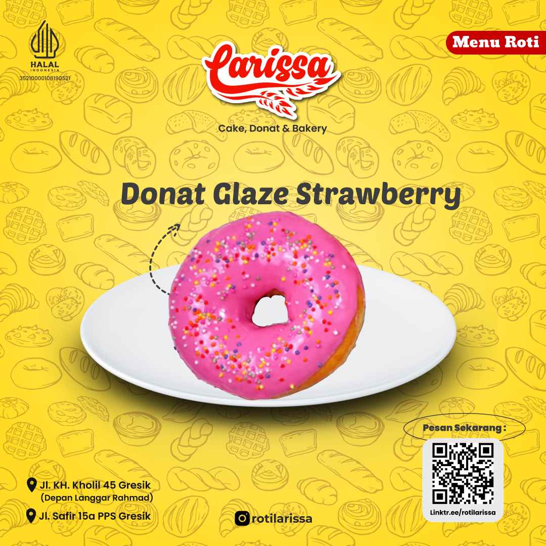 Donat Glaze Strawberry dikemas dalam kardus yang menjaga kelezatan dan tampilannya. Kemasan ini praktis dan higienis, membuatnya mudah dibawa atau dijadikan oleh-oleh.