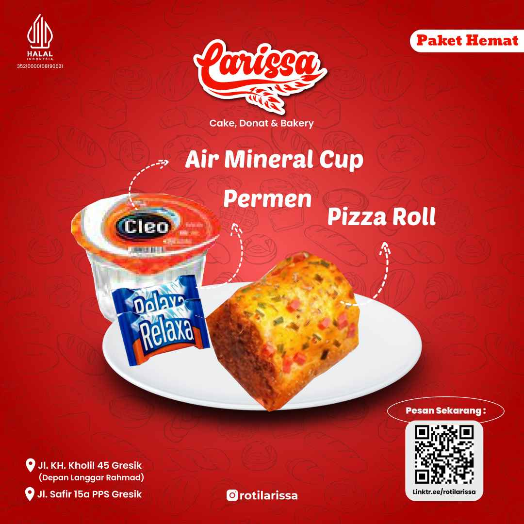 Paket Hemat 2 yang berisi Air Mineral Cup, Permen, dan Pizza Roll: