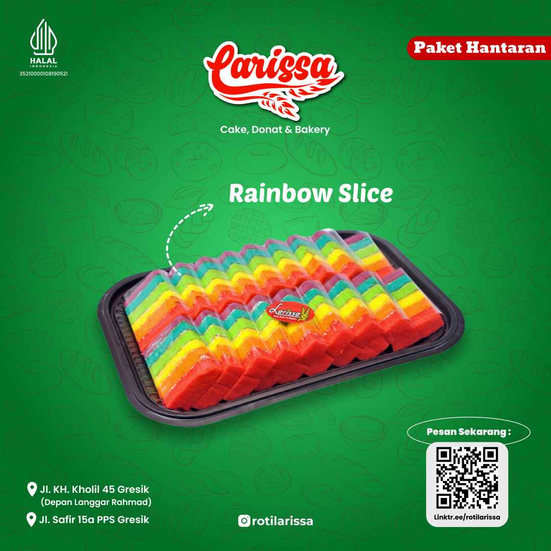 Roti Rainbow Slice dikemas dalam kemasan praktis dan higienis, menjaga kesegaran dan kualitas roti. Kemasan ini cocok untuk dibawa bepergian atau sebagai oleh-oleh yang unik.