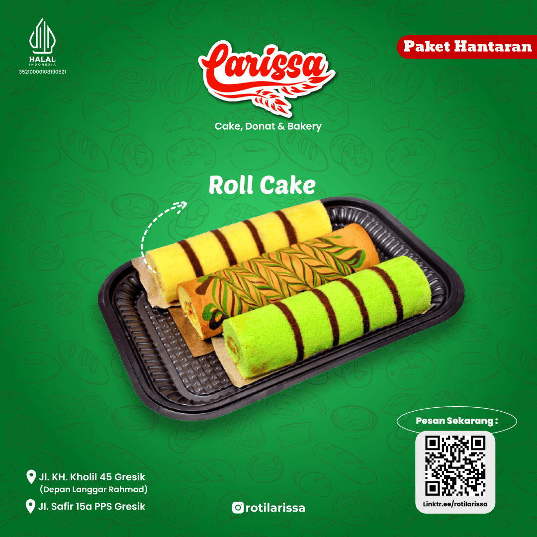 Roll Cake adalah kue gulung lembut yang dibuat dari adonan sponge cake yang halus dan diisi dengan berbagai rasa krim atau selai. Kue ini digulung dengan sempurna, menciptakan lapisan cantik yang menggoda selera.