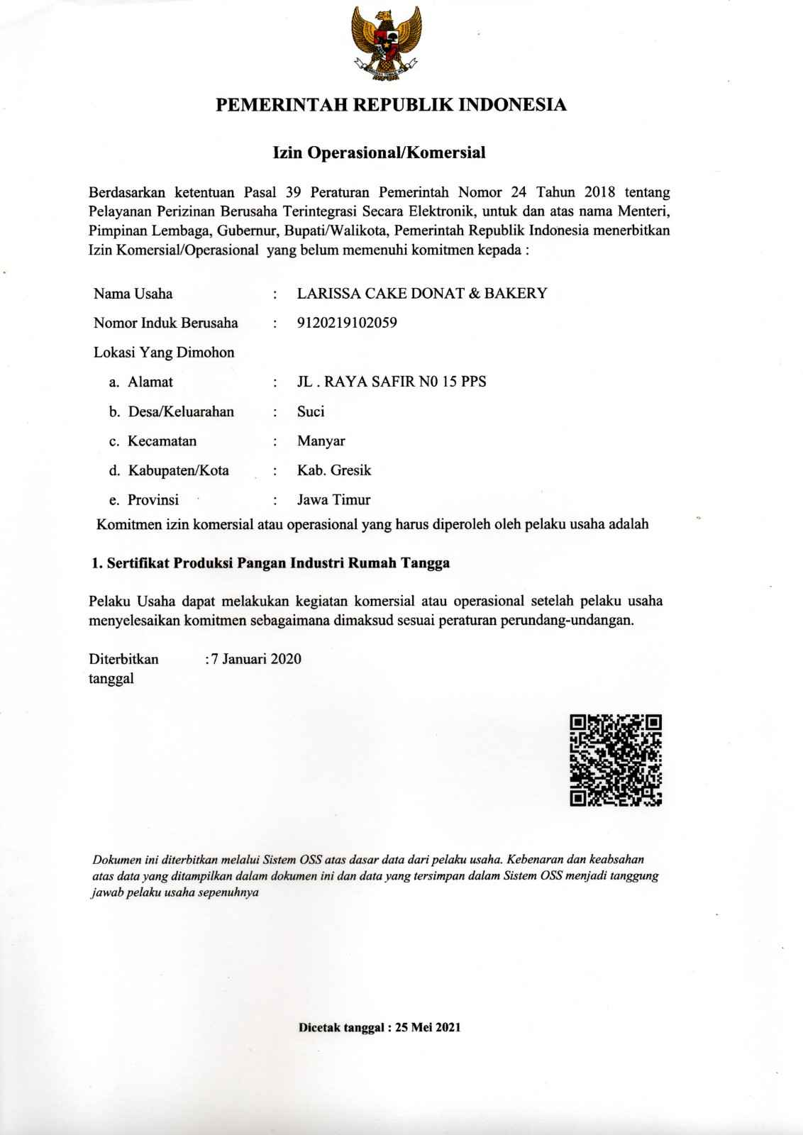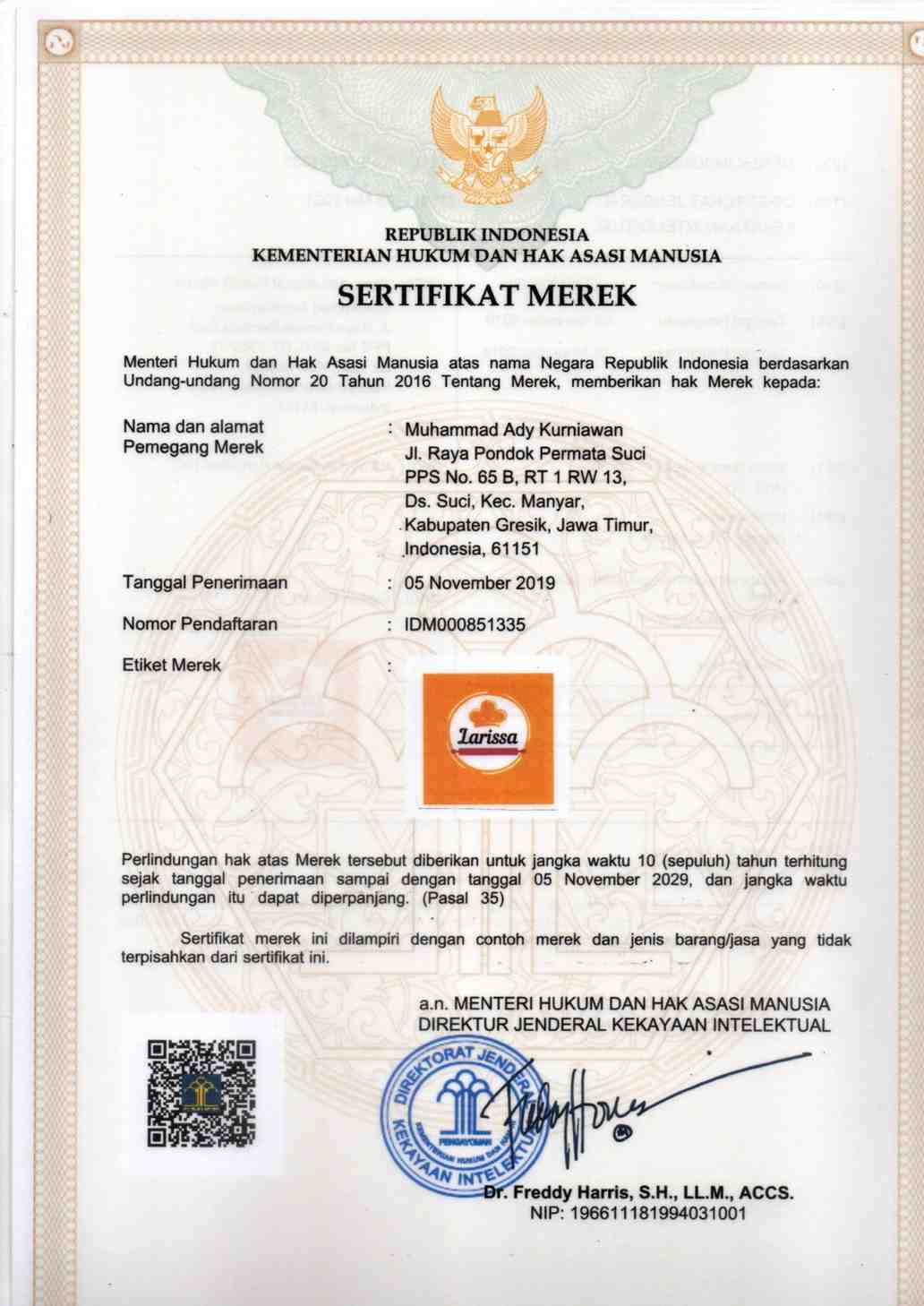 Larissa Bakery telah memperoleh sertifikasi dari lembaga-lembaga terkait dibidang kebersihan dan keamanan pangan Halal MUI